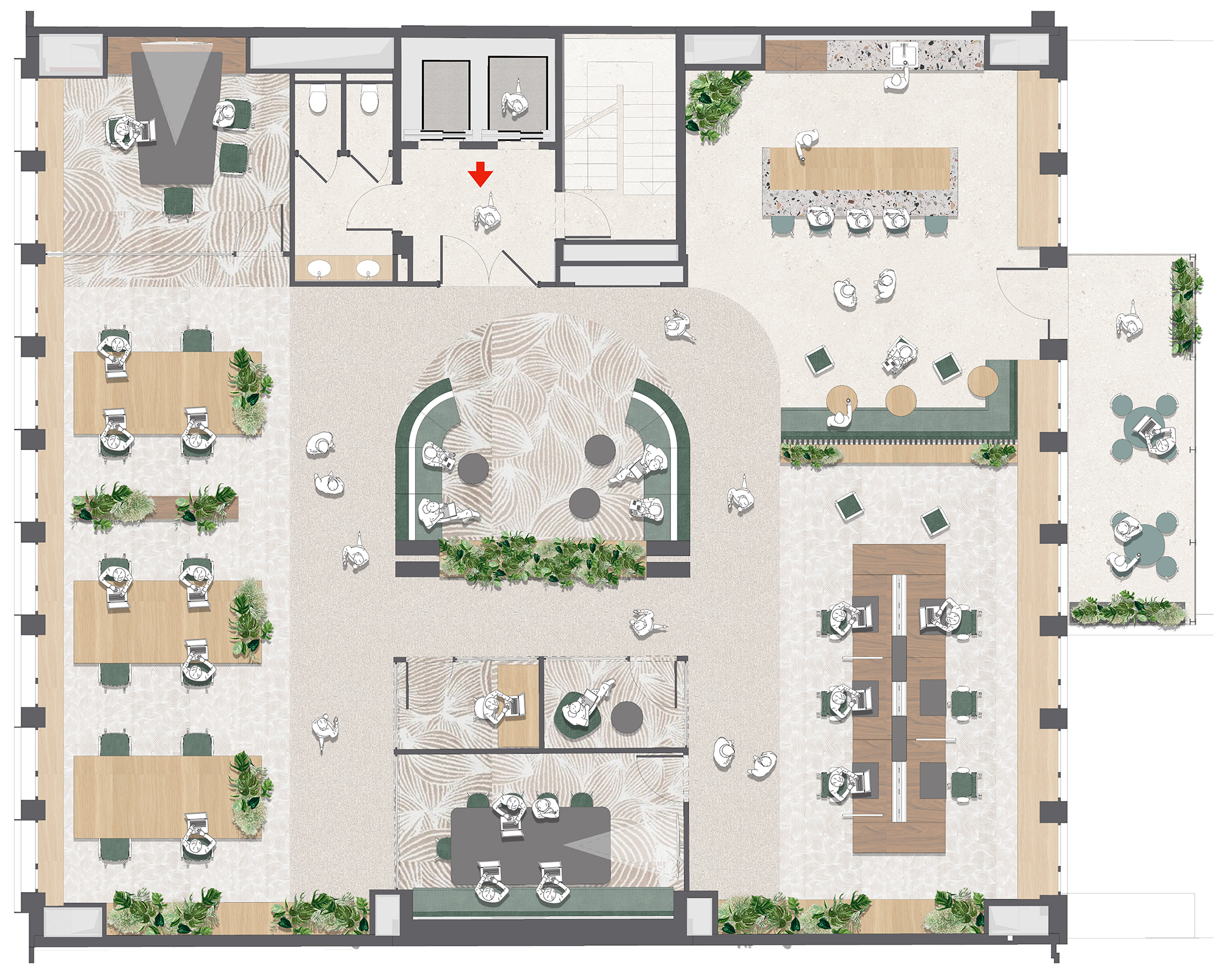The ground floor entrance blends functionality with a warm, inviting atmosphere. Bathed in natural light and enhanced by indoor and outdoor plants, the ground floor is ideal for meetings whether formal or informal.