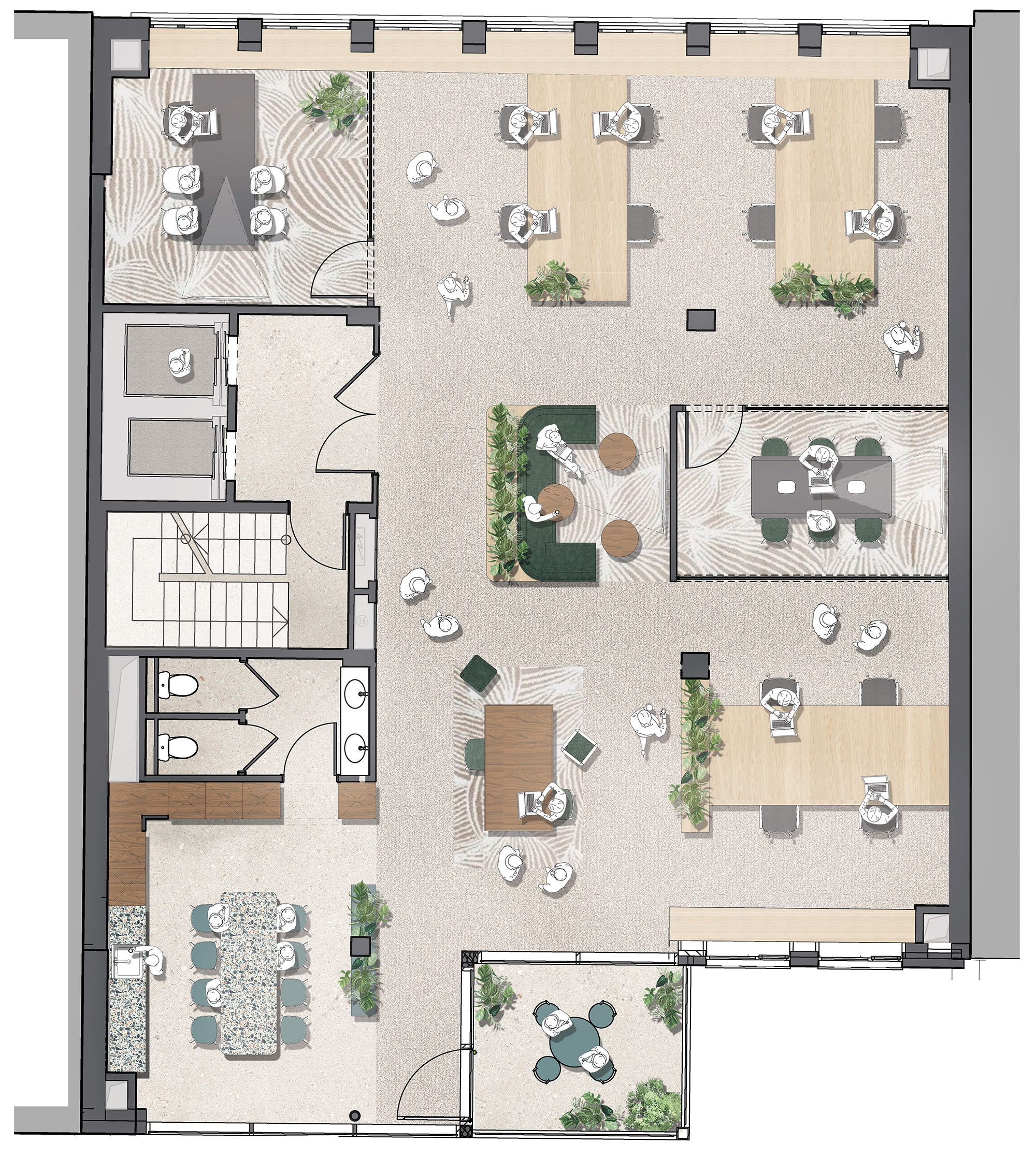 Each floor is designed with versatility in mind, allowing you to create the perfect environment for your team’s productivity and growth. Noble and natural materials such as stone and wood have been thoughtfully integrated throughout, reflecting a nature-first design philosophy that promotes both tranquillity and inspiration.